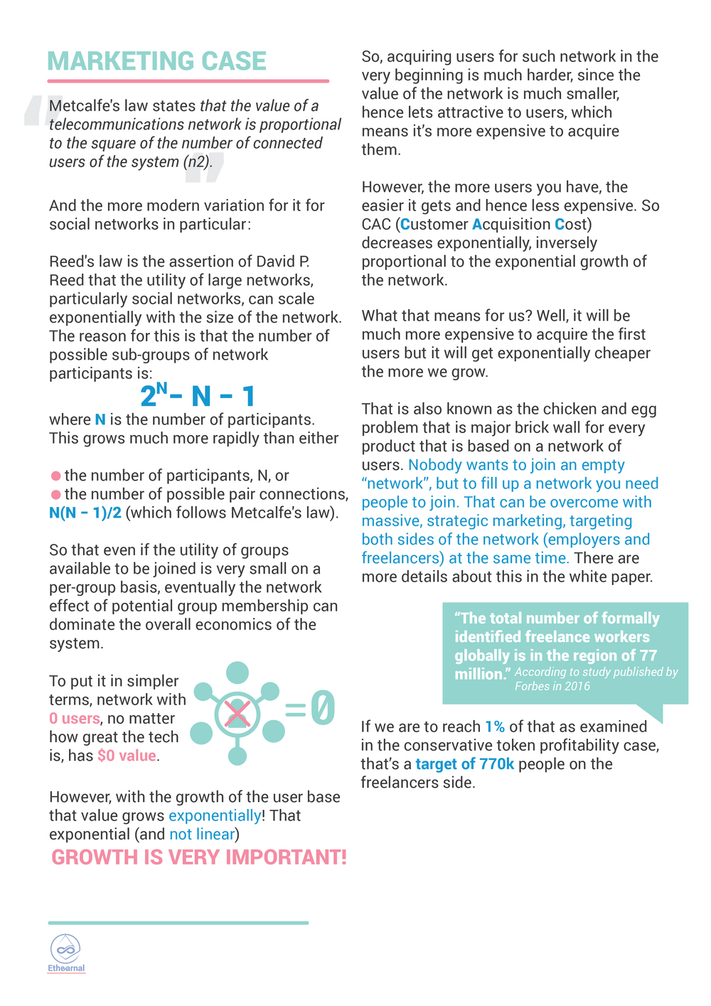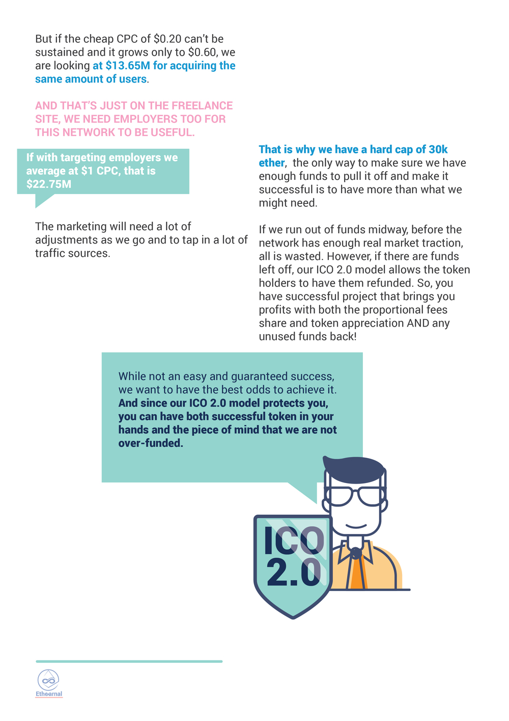 OpenAI in the search engine and the Ethearnal Personal Assistant Bot.Reddit ads on all subreddits for getting jobs for crypto. This is the smallest reach, but most targeted auditory.Facebook ads targeting only people in crypto-related and freelance-related Facebook groups simultaneously. The people in both simultaneously are not much, but it is very targeted.LinkedIn campaign targeting anyone involved in crypto and has skill set in demand on the network.AdWords ads to people searching for crypto- and freelance-related stuff.Airdrop of ERT to all ether addresses with non-insignificant balances.Bounties for users of the system, who achieve first certain marks (i.e., jobs done, money spent, and so on), adding a gamification element and opportunities to make announcements.Measure performance. Adjust. Repeat.Google AdWords at Google Search. Targeting 1000s of long tail key phrases related to online freelance work and finding freelancers (for the employers). Having 1000s of long tail phrases allows for much lower cost per click (CPC) with the benefit of having very targeted traffic.Facebook ads optimized for high click-through rates (CTR), so the CPC gets lower and lower with time. This is how Facebook ads work. The higher CTR you have, the lower the CPC becomes. We will target fans of relevant freelance pages.