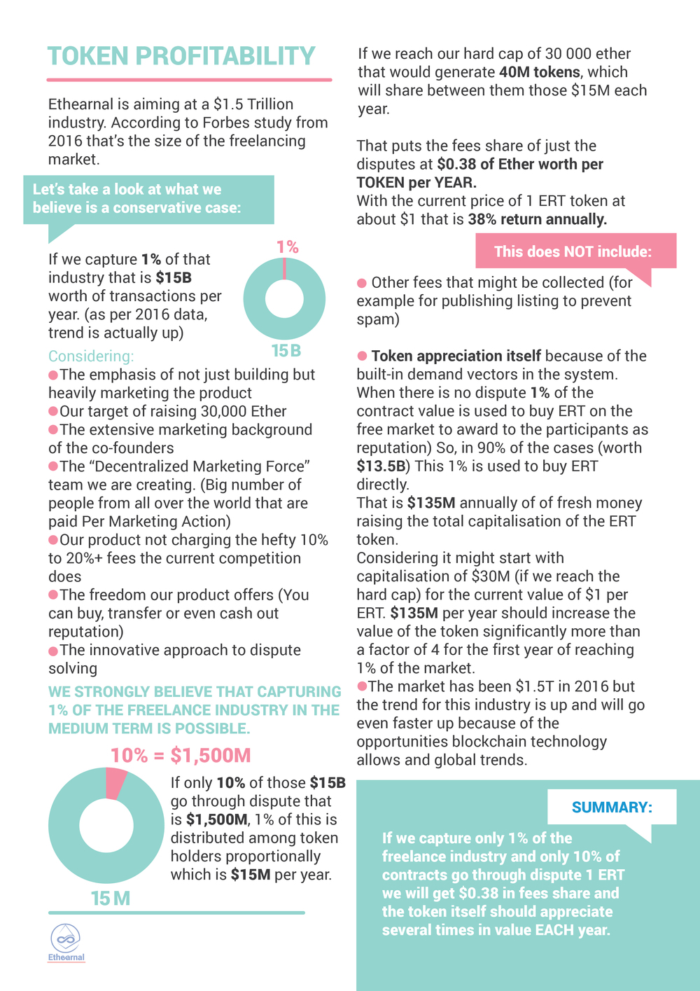 We collide reputation and economic initiative into one by tokenizing reputation and giving it value. Your reputation is worth real money, can be bought, sold or transferred. You stake some of it when entering a contract. The more reputation you have, more visible you are in the network and can participate in bigger projects. It’s up to the offer creator to set how much reputation he wants at stake, but it’s to be expected that bigger projects will require more reputation at stake. Reputation is called Ethearnal Reputation Token or ERT and is what we are selling in our ICO.
